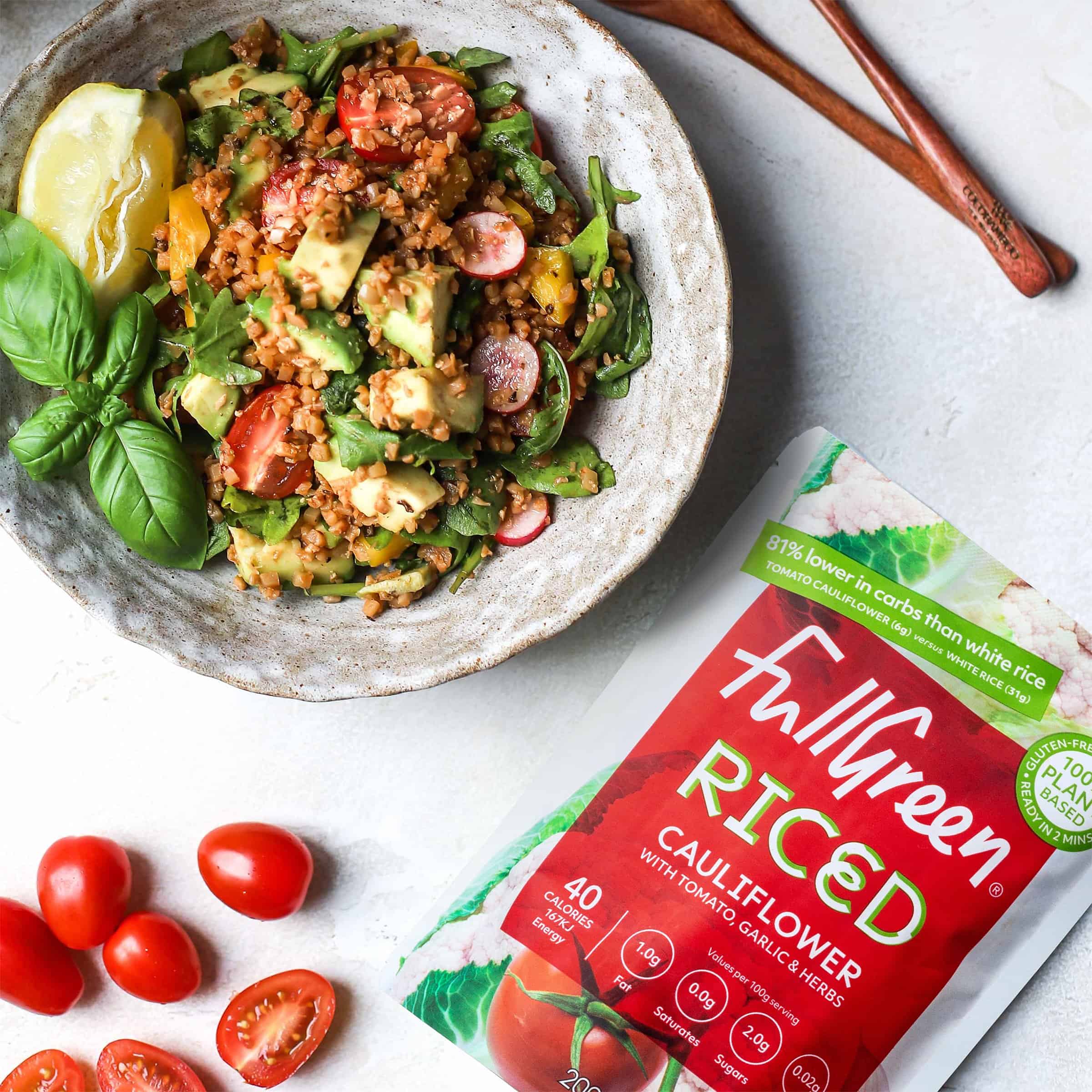 FullGreen’s Riced Cauliflower mixed with the intense Mediterranean flavours of tomato, garlic and herbs. You get the same amazing low-carb benefits of our standard riced cauliflower combined with a flavour explosion that would make your mouth water. Each pouch contains 2 servings of veg and has just 80 calories and 12 grams of carbs. It’s the perfect side to dishes like Chili Con Carne or a tomato-based curry. Made with non-GMO cauliflower and no preservatives, additives or salt – and because it’s shelf-stable you can keep it in your kitchen cupboard, gym bag or office drawer for whenever you need it.